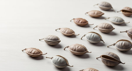 Dried seed pods and capsules scattered on a light neutral background with soft lighting