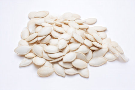 A close-up of raw white pumpkin seeds arranged neatly on a clean white surface, ideal for conceptualizing healthy snacks and illustrating nutrition and wellness concepts.