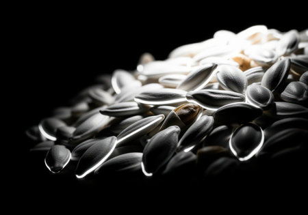 Pile of white shelled sunflower seeds with intense rim lighting against a pure black background. emphasizes texture, contrast, and natural food snack.