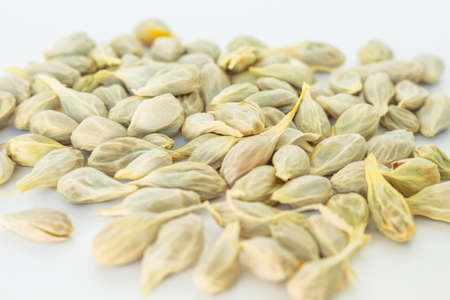 Peeled sunflower seeds piled up and shown in white