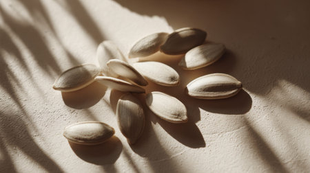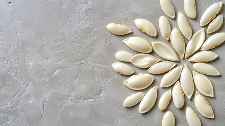 This image showcases light-colored pumpkin seeds arranged artistically on a textured surface, with soft shadows that enhance the natural beauty and organic feel of the composition.