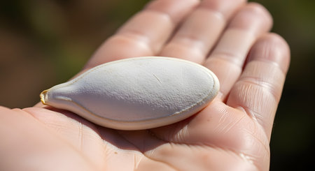 A detailed macro shot shows a single white pumpkin seed resting in the palm of a hand. The shallow depth of field emphasizes the texture of the seed shell and the lines on the person's hand, symbolizing potential, growth, and nature.