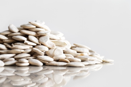 A creative heap of dried pumpkin seeds set of a reflective ceramic surface against a white background