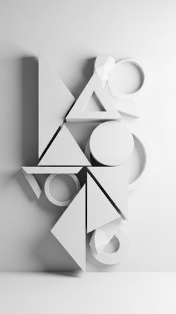 A modern minimalist composition featuring various white geometric shapes arranged artistically against a soft backdrop, creating a serene and balanced visual appeal.