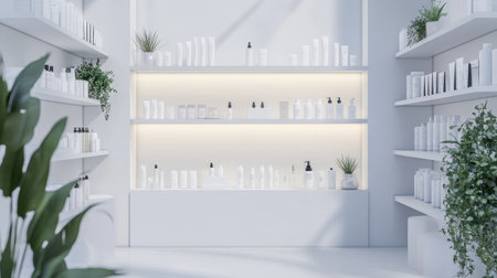 Minimalist wall mockup in a well-lit beauty department store, surrounded by modern shelves on each side, perfect for product display or branding