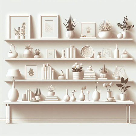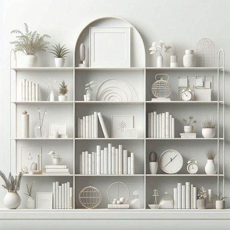 This image features elegant white shelves adorned with minimalistic decor and neatly arranged books, embodying modern simplicity and sophistication.