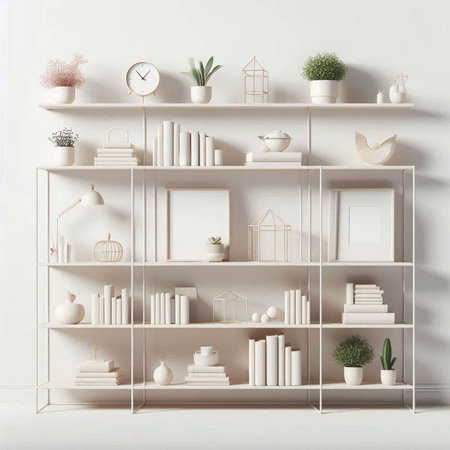 White bookshelves with decorative elements. 3d render illustration.