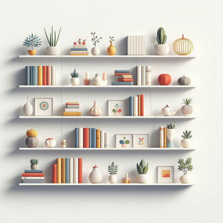 3d rendered bookshelves with decorative elements on white wall.