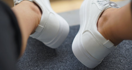 Close-up of womens white leather sneakers in the shade of the blinds.