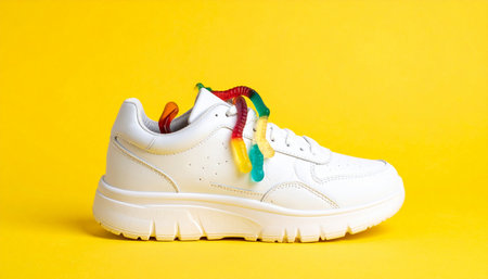 A single white sneaker stands out against a vibrant yellow background, its laces a brilliant rainbow of color.