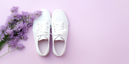 A pair of white sneakers sitting on top of a table with flowers, AI