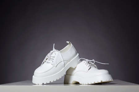 white sport boots on the table. fashion shoes still life. stylish photo in the studio