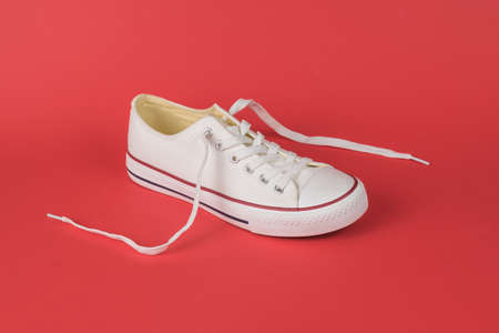 A white sneaker with a blue and red stripe with untied laces on a red background. Minimal sports concept.
