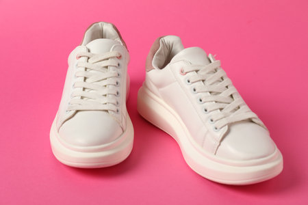Pair of White sneakers on pink background. Concept of healthy lifestyle and food, everyday training and force of will.