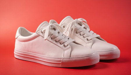 White sneakers on a red background. Fashionable shoes. Studio shot.