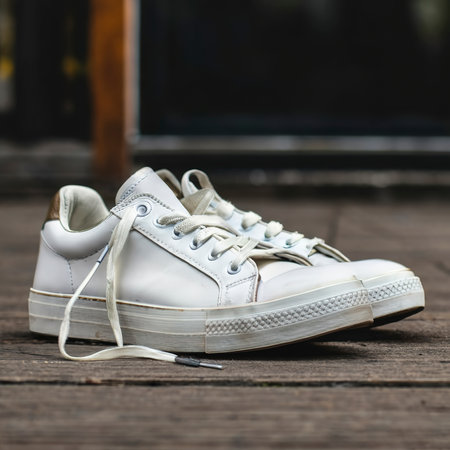 White sneakers on dark wooden surface. Shoes for women in sport fashion style.