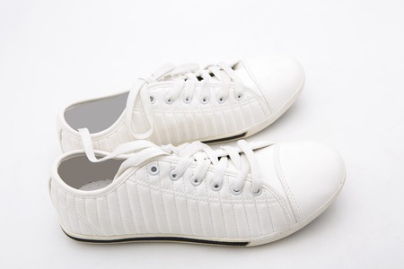 White women sneakers in the studio on white background. Fashion shooting for catalog or store indoors