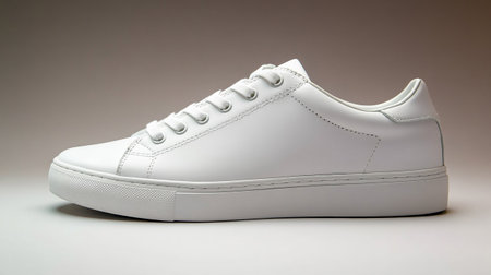 Sleek white sneakers are positioned on a pristine surface, highlighting their contemporary style and smooth materials, perfect for fashion and lifestyle imagery, AI generated