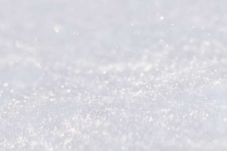 Close up macro photography texture of sparkling fresh white snow with light blue sky reflection tone. selective focus. winter christmas background.