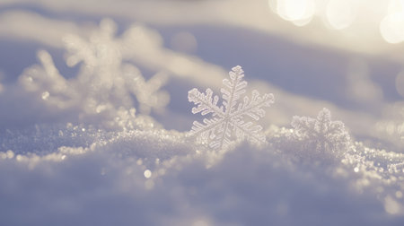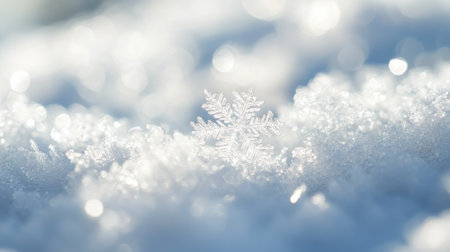 A photo of snowflakes on sunlit snow, highlighting atmosphere, landscape, clouds, and meteorological phenomena