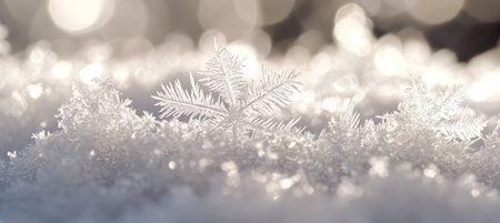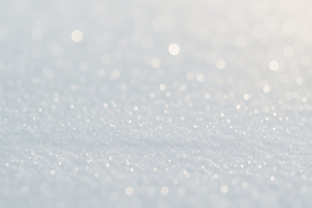 A stunning close-up view of a snowy surface glittering under sunlight. The frost creates a captivating scene of tranquility, showcasing the beauty of winter outdoors.