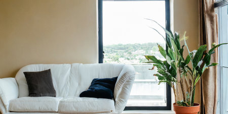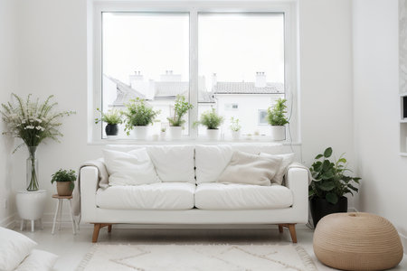 Interior of modern living room with white sofa, window and plants