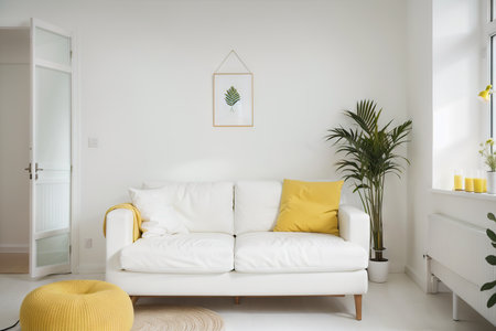 White room with yellow sofa. Scandinavian interior design.
