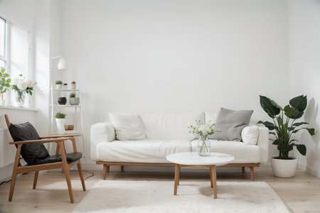 Living room interior with white sofa, coffee table and plant in vase