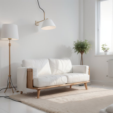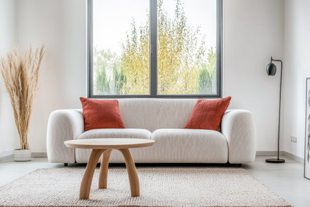 Bright and inviting modern minimalist living room featuring a cozy sofa, elegant decor, and stylish lamps. Ideal for interior design inspiration or home decor projects.