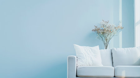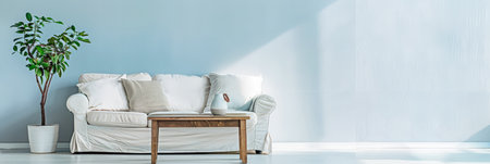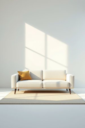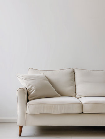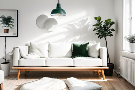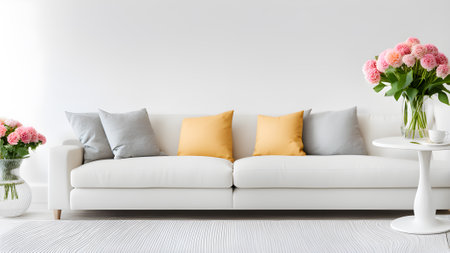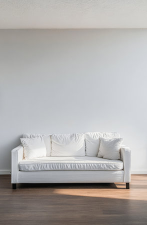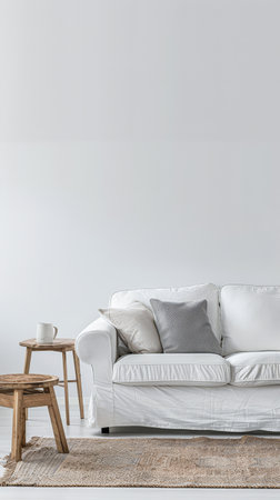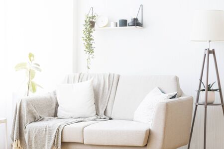 Elegant European living room with cozy sofa, throw pillows and minimalist decor, blank white wall with highlights