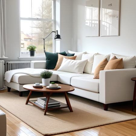 This modern living room presents a sleek design with a white sofa adorned with soft cushions, offering a bright and inviting atmosphere, perfect for relaxation.