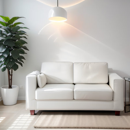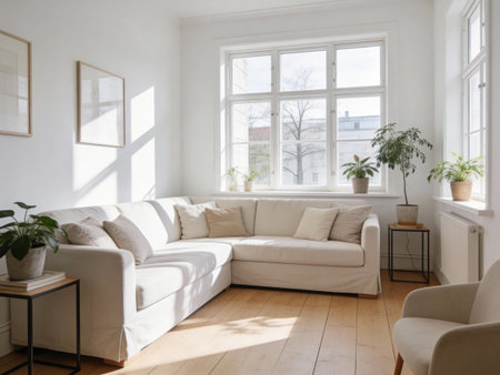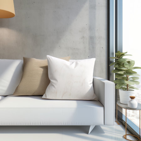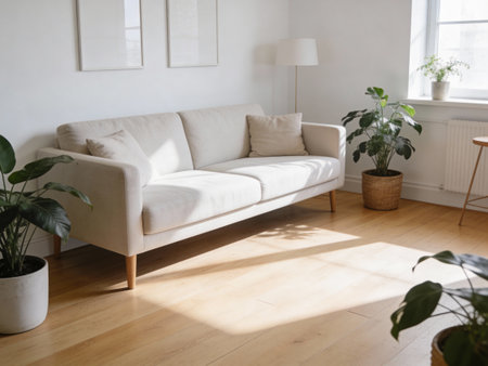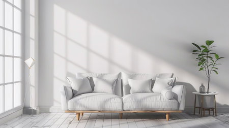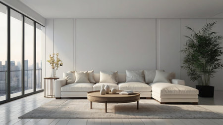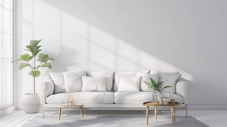 Modern minimalist living room with elegant white sofa, decorative cushions, natural light, and lush green plants against a neutral wall backdrop, interior design
