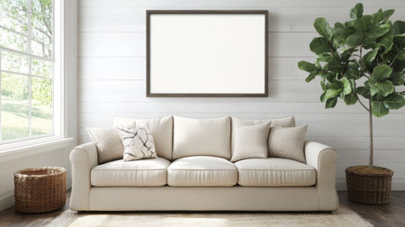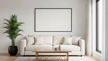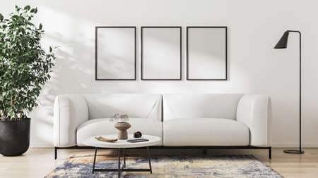 Blank poster frame mock up in scandinavian style living room interior, modern living room interior background, white sofa and green plant in pot, 3d rendering