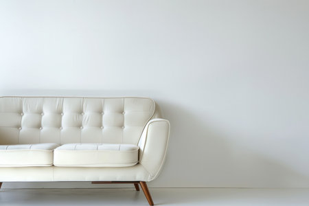 A white leather sofa sits in front of a white wall in a minimalist room.