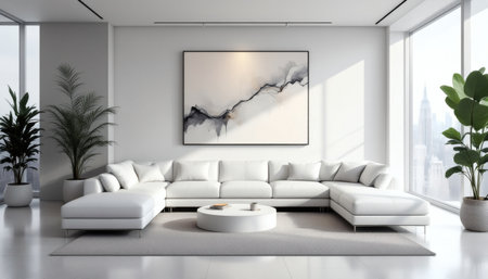 Sleek modern living room featuring a white sectional sofa, abstract art, and large windows with city views, ideal for home decor inspiration.