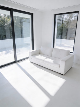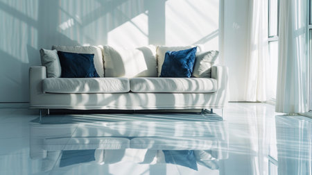Bright and contemporary living room interior featuring a white sofa, blue cushions, and sunlight streaming through large windows, creating a clean and serene ambiance.