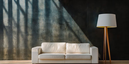 A sleek white sofa is positioned against a dark textured wall illuminated by vivid sunlight casting striking shadows. A contemporary floor lamp stands nearby enhancing the modern aesthetic.