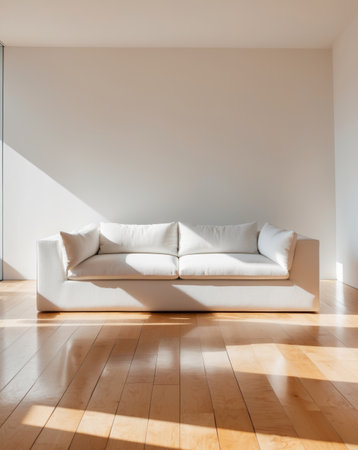 A white couch sits against a plain wall in a spacious minimalist room. Soft natural light streams in highlighting the clean lines of the furniture and the warm wooden floor.