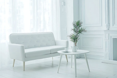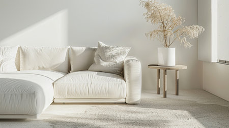 Bright and airy living room featuring a white couch, small table, and a decorative plant, creating a serene and elegant minimalist atmosphere.