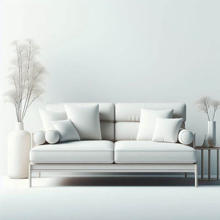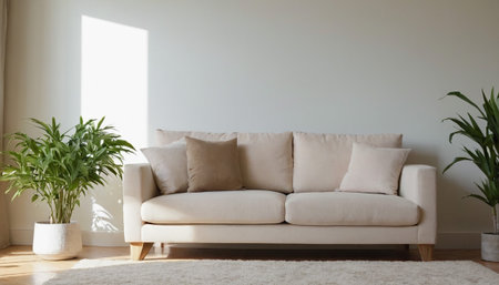 A cozy modern sofa, adorned with soft cushions, is placed in a minimalist living room. Surrounded by lush indoor plants, this space exudes tranquility and style.