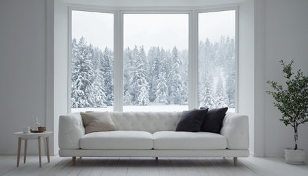 A white tufted sofa sits in a bright room with a large bay window showing a snow-covered forest.