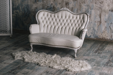 White vintage sofa and fur carpet on floor.