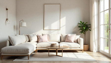 Bright living room with sectional sofa and frame mockup