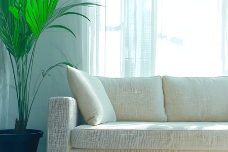 A cozy white sofa adorned with a decorative pillow sits beside a lush green plant, enhancing the serene ambiance of a modern living space filled with natural light.