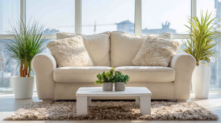 A pristine white sofa adorned with plush cushions sits gracefully in a well-lit living room. Surrounded by luscious indoor plants and resting on a textured rug - it epitomizes modern comfort and style. Ideal for showcasing the allure of minimalist interior designs.