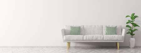 Modern interior design of living room with white sofa and plant panorama 3d rendering
