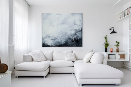 Living room with white couch and large painting on the wall. Generative AI.