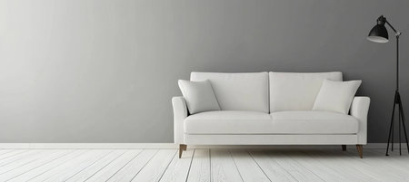 Minimalist Living Room Interior With White Sofa, Floor Lamp, And Empty Wall, Modern Design Concept.