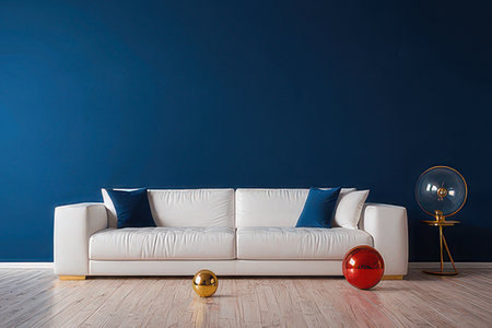 Living room interior with white sofa and blue wall. 3d render