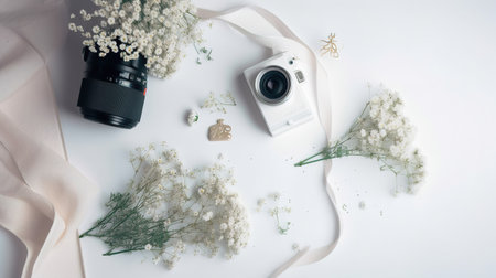 Flat lay of vintage camera and white gypsophila flowers on white background. generative ai